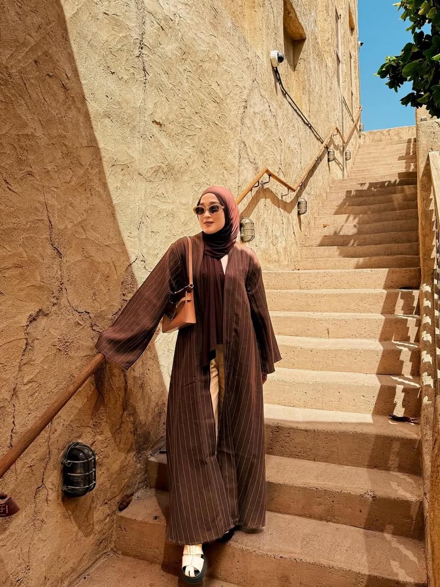 Ririe tampil sangat serasi dengan warna kota tua di Dubai menggunakan outer dan hijab berwarna coklat.