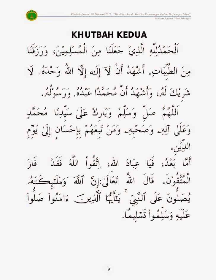 الْحَمْدُ لِلهِ الَّذِيْ بِنِعْمَتِهِ تَتِمُّ الصَّالِحَاتُ، وَبِفَضْلِهِ تَتَنَزَّلُ الْخَيْرَاتُ وَالْبَرَكَاتُ، وَبِتَوْفِيْقِهِ تَتَحَقَّقُ الْمَقَاصِدُ وَالْغَايَاتُ. أَشْهَدُ أَنْ لَا إِلَهَ إِلَّا اللهُ وَحْدَهُ لَاشَرِيْكَ لَهُ وَأَشْهَدُ أَنْ مُحَمَّدًا عَبْدُهُ وَرَسُوْلُهُ لَانَبِيَّ بَعْدَهُ. اللهم صَلِّ وَسَلِّمْ وَبَارِكْ عَلَى سَيِّدِنَا مُحَمَّدٍ وَعَلَى آلِهِ وَصَحْبِهِ المُجَاهِدِيْنَ الطَّاهِرِيْنَ. أَمَّا بَعْدُ، فَيَا آيُّهَا الحَاضِرُوْنَ أُوْصِيْكُمْ وَإِيَّايَ بِتَقْوَى اللهِ وَطَاعَتِهِ لَعَلَّكُمْ تُفْلِحُوْنَ. يَا أَيُّهَا الَّذِينَ آمَنُوا اتَّقُوا اللَّهَ حَقَّ تُقَاتِهِ وَلَا تَمُوتُنَّ إِلَّا وَأَنْتُمْ مُسْلِمُونَ، وَتَزَوَّدُوا فَإِنَّ خَيْرَ الزَّادِ التَّقْوَى. أَعُوذُ بِاللهِ مِنَ الشَّيْطَانِ الرَّجِيمِ. بِسْمِ اللهِ الرَّحْمَنِ الرَّحِيمِ. إِنَّ اللهَ وَمَلَائِكَتَهُ يُصَلُّونَ عَلَى النَّبِيِّ يَا أَيُّهَا الَّذِينَ ءَامَنُوا صَلُّوا عَلَيْهِ وَسَلِّمُوا تَسْلِيمًا. اللَّهُمَّ صَلِّ عَلَى سَيِّدِنَا مُحَمَّدٍ وَعَلَى آلِ سَيِّدِنَا مُحَمَّدٍ كَمَا صَلَّيْتَ عَلَى سَيِّدِنَا إِبْرَاهِيمَ وَعَلَى آلِ سَيِّدِنَا إِبْرَاهِيمَ وَبَارِكْ عَلَى سَيِّدِنَا مُحَمَّدٍ وَعَلَى آلِ سَيِّدِنَا مُحَمَّدٍ كَمَا بَارَكْتَ عَلَى سَيِّدِنَا إِبْرَاهِيمَ وَعَلَى آلِ سَيِّدِنَا إِبْرَاهِيمَ إِنَّكَ حَمِيدٌ مَجِيدٌ. اللَّهُمَّ اغْفِرْ لِلْمُسْلِمِينَ وَالْمُسْلِمَاتِ، وَالْمُؤْمِنِينَ وَالْمُؤْمِنَاتِ الْأَحْيَاءِ مِنْهُمْ وَالْأَمْوَاتِ، إِنَّكَ سَمِيعٌ قَرِيبٌ مُجِيبُ الدُّعَوَاتِ. اللَّهُمَّ اغْفِرْ لَنَا ذُنُوبَنَا وَذُنُوبَ وَالِدَيْنَا وَارْحَمْهُمَا كَمَا رَبَّيَانَا صِغَارًا. رَبَّنَا اغْفِرْ لَنَا وَلِإِخْوَانِنَا الَّذِينَ سَبَقُونَا بِالْإِيمَانِ وَلَا تَجْعَلْ فِي قُلُوبِنَا غِلًّا لِّلَّذِينَ آمَنُوا رَبَّنَا إِنَّكَ رَؤُوفٌ رَحِيمٌ. رَبَّنَا ظَلَمْنَا أَنْفُسَنَا وَإِنْ لَّمْ تَغْفِرْ لَنَا وَتَرْحَمْنَا لَنَكُونَنَّ مِنَ الْخَاسِرِينَ. رَبَّنَا ءَاتِنَا فِي الدُّنْيَا حَسَنَةً وَفِي الْآخِرَةِ حَسَنَةً وَقِنَا عَذَابَ النَّارِ. عَبَادَ اللهِ، إِنَّ اللهَ يَأْمُرُ بِالْعَدْلِ وَالْإِحْسَانِ وَإِيتَاءِ ذِي الْقُرْبَى وَيَنْهَى عَنِ الْفَحْشَاءِ وَالْمَنْكَرِ وَالْبَغْيِ لَعَلَّكُمْ تَذْكُرُونَ. فَأَذْكُرُوا اللهَ الْعَظِيمَ يَذْكُرُكُمْ وَاسْأَلُوهُ مِنْ فَضْلِهِ يُعْطِيكُمْ. وَلِذِكْرِ اللهِ أَكْبَرُ.
